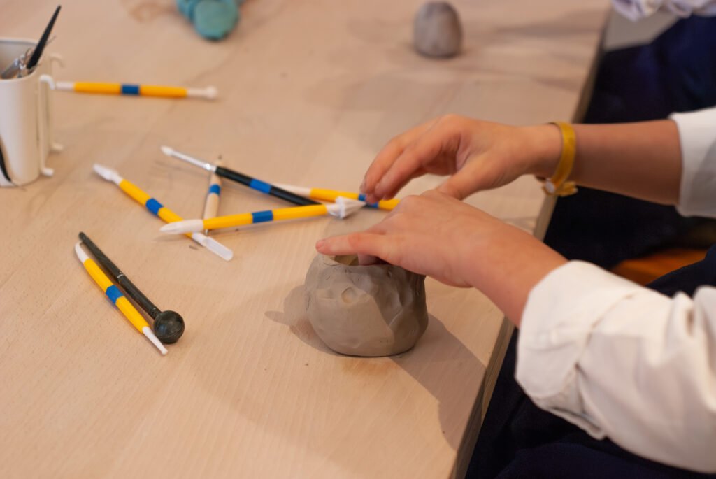 Close-up of hands molding a clay pitcher on a pottery wheel, showcasing craftsmanship.
